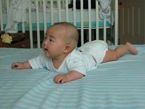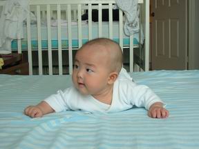 宝宝3个月的时候,终于能够撑住自己的头了。当宝宝能撑住头的时候,宝宝也就能趴着,而不是那么痛苦的把鼻子捂在床上了。但趴的时间要看宝宝的心情,心情好的时候,她会转着小脑袋,睁着大眼睛,很好奇的到处乱看。毕竟,视线随着她的抬头,大大开阔了。但心情不好的时候,她仍然是捂着脸,一把鼻涕一把眼泪,再加上飞流直下三千尺的口水,然后把这些东西尽数涂在我们的床单上。