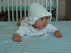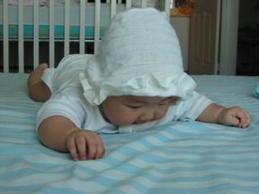 宝宝戴着这顶小白帽子,象不象一个小管家。这顶小帽子可不会再把宝宝的眼睛遮住了。可惜,天已经热了,等天气再凉了,宝宝的头会不会大的戴不下了呢?