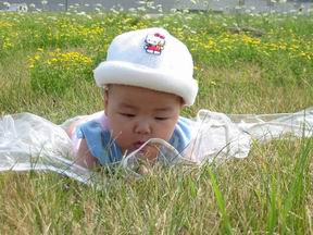 带着宝宝来到离家不远的一片开满了小黄花的草地上拍外景。把小推车的遮风罩铺在地上,让宝宝趴在上面。虽然天很热,妈妈仍然给宝宝戴了一顶厚厚的小帽子,要拍宝宝戴着这顶小帽子的样子。
