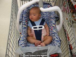 每次去买菜,都要带上宝宝的小坐椅。到了超市,就把她放在超市的大推车中。于是大推车几乎变成了宝宝的专用移动坐椅。真正采购的东西往往只能东塞西挤的见缝插针。采购完毕,宝宝就成了坐在蔬菜、水果和肉搭的小房子里的小看守。这时候我们再逗宝宝笑,别人就会奇怪的望过来,他们一定在想,这人,在发什么神经呢。