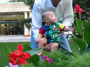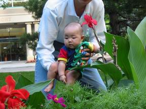 带着宝宝到楼下花园拍外景照。叫爸爸抱着,拍这几朵漂亮的花和草。不务正业的宝宝任凭妈妈又唱又叫,就是不肯看照相机。对身边的颜色鲜艳的花发生了兴趣。