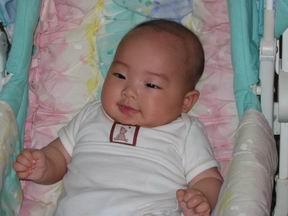 宝宝的神态真是有趣。这张怎么看怎么就是一个贪贪的小领导的样子。快4个月的宝宝开始爱玩口水。经常满嘴的泡泡,象一只小螃蟹。然后口水就顺着嘴角流啊流,还特别爱把湿湿的小嘴往你脸上蹭。你笑着躲,她还以为你逗她玩,高兴的咯咯笑着,嘴又上来了。