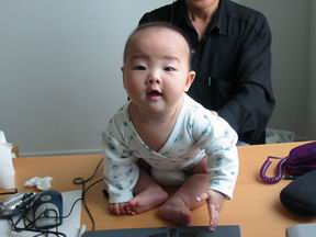 上了桌的宝宝可就不那么安耽了。她显示出了无穷的精力。她对桌上的一切可抓的东西都有兴趣。尤其是电话线,耳机线和鼠标等可以轻易抓住的东西。别看宝宝小,破坏力可不小,抓住耳机的线就用两只手猛烈撕扯,真担心她能把线扯断为止。
