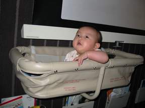 宝宝在飞机上挺配合,当时天气很好,没有碰上什么气流,飞机飞的很平稳,起飞降落也没有需要喂奶,小宝宝很安静的在我们的怀里,好奇的对着四周的人张望。宝宝是我们乘坐的这架飞机上第一个小客人,机上乘务员居然还不知道该如何安装小朋友的小坐骑。不过空姐可对宝宝宠爱有加,时不时来逗逗宝宝,宝宝一哭,她们可比爸爸妈妈还着急。但宝宝对她的小坐骑居然还不是非常满意,一有机会,就嚷嚷着要抱,可还真把同行的爸爸妈妈累坏了。