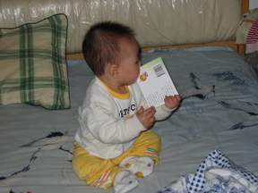 我长大了,要学习象大人一样的看书识字了。认真的小宝宝一本正经的坐在床上,开始了她人生当中第一次自学。