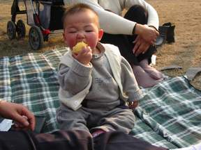 南方的天气尽管在冬天也总是暖暖的。11月了,还经常有很好的太阳。我们经常带着丫丫去奶奶家附近的小公园。铺上我们从加拿大带来的小垫子,丫丫就可以任意的在上面摸爬滚打。奶奶带来了苹果,给丫丫削了皮后,就整个给了她。因为我们经常让丫丫自己学习抓捏东西,尽管有时候弄的一片狼籍,也随她去。所以丫丫的手灵活性很好,这时候已经能够自己抓着东西往嘴里塞了。还吃的像模像样。