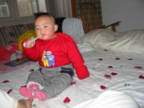 这可是丫丫最重要的怪脸之一,作得非常有难度,一般人可是学不象的呢!需要脸部所有肌肉的配合。首先眉头皱起,眼睛眯成一条线。然后鼻子同时皱起,小嘴张开,最重要的是还要露出丫丫最好看的两颗上门牙。说到丫丫这时候长的上下各两颗的门牙,不得不提一句,丫丫的牙齿也极有特色,上面两颗门牙挺大,之间的缝隙可以塞一个扁豆进去。下面呢,靠的紧紧的,挤来挤去的挤成了一个“八”字。很多人见了都安慰我,小时候牙齿难看,大了就好了,小时候整齐,大了反而糟了。要说到这个鬼脸是怎么来的,谁也不知道,直到忽然有一天,我发现怎么和丫丫的保姆的笑容很相似,保姆说她曾经带的小孩也有同样的鬼脸,才知道,原来这么“灿烂”的笑容,真的是出自保姆的手笔啊!