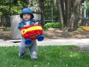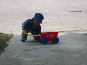 丫丫自始至终就没有按照我设想的方式拉过这辆小车,于是想拍丫丫趾高气扬、昂首挺胸拖着小车走的照片全线失败。看来丫丫对轮子滚动的原理还要好好研究研究,学习学习。