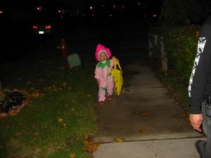 晚上和几个朋友的孩子一起去敲门要糖,路上无数牛鬼蛇神。有些面目可怕,有些美丽的象神话故事里的仙女。有些房子布置的很有意思,门口和屋内装饰了许多过节的饰物。一开门让人吓一跳。要糖可不是轻松的活,挨家挨户的敲门,每家都要上楼梯,下楼梯,丫丫都要我这个随从搀扶进行的。人家孩子一见开门,都忙着大大的撑开带子,多多益善,丫丫这个小傻瓜,人家一开门,要不就冲人家扭屁股,要不就对各种装饰看的发呆,最后往往是妈妈尴尬的笑笑,赶紧接过糖,拎起丫丫,说声BYEBYE立马撤。