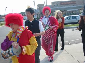 活动结束后,所有人参加了游行。大家拿着各种会叫会响的东西,敲敲打打,大呼小叫的,在一个戴着黑色高帽,打扮成一个小巫婆的老师的带领下,开始游行。