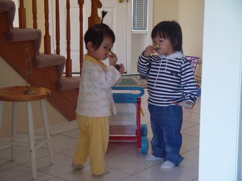 Andrea爸爸这张照片镜头抢的真好,后来看照片才知道小丫头们还有过这么可爱的动作。感觉Andrea妈妈是早有预谋,连铃铛都准备了双份的呢。孩子真是互为榜样,看这两个小丫头,步调多么一致,连放的部位都一样呢。