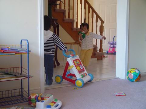 上下楼梯是丫丫的最爱,到任何一家有楼梯的房子,楼梯就成了丫丫最大的玩具。她会把楼梯当滑梯,一个屁墩一个屁墩的从顶上滑下来。也不怕颠疼了她的小屁股,到底是有尿布,缓冲能力不小啊。这是两个小朋友在楼梯上追逐,虽然Andrea妈妈总谦虚小Andrea的运动能力,但见过了才知道,Andrea可一点不差,这楼梯爬的,比猴子还快,眨眼就已经在顶上了。