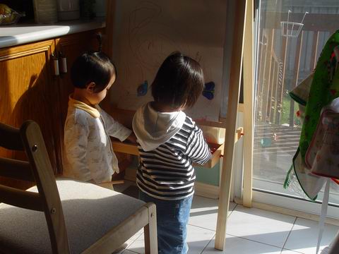 两个小画家正在挥毫泼墨,即兴涂鸦。