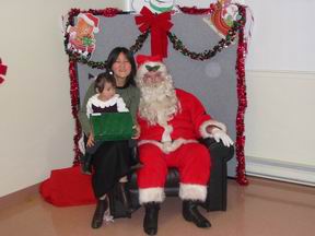 丫丫不肯合影,折腾半天最后我一屁股坐到圣诞老人膝盖上。感觉圣诞老人抱着个有史以来最巨大的大娃娃,然后大娃娃手里再抱着个小娃娃。礼物还把圣诞老人的脸给遮了一半,本来白头发白胡子的就没露多少肉,现在更加看不到什么东西了。整张照片几乎就看到我巨大的身子。(从小没和圣诞老人合影,其实是找机会弥补,这下可过瘾了)。丫丫呢,就直着眼扭头看着我手里的礼物,一点也不给圣诞老人面子。