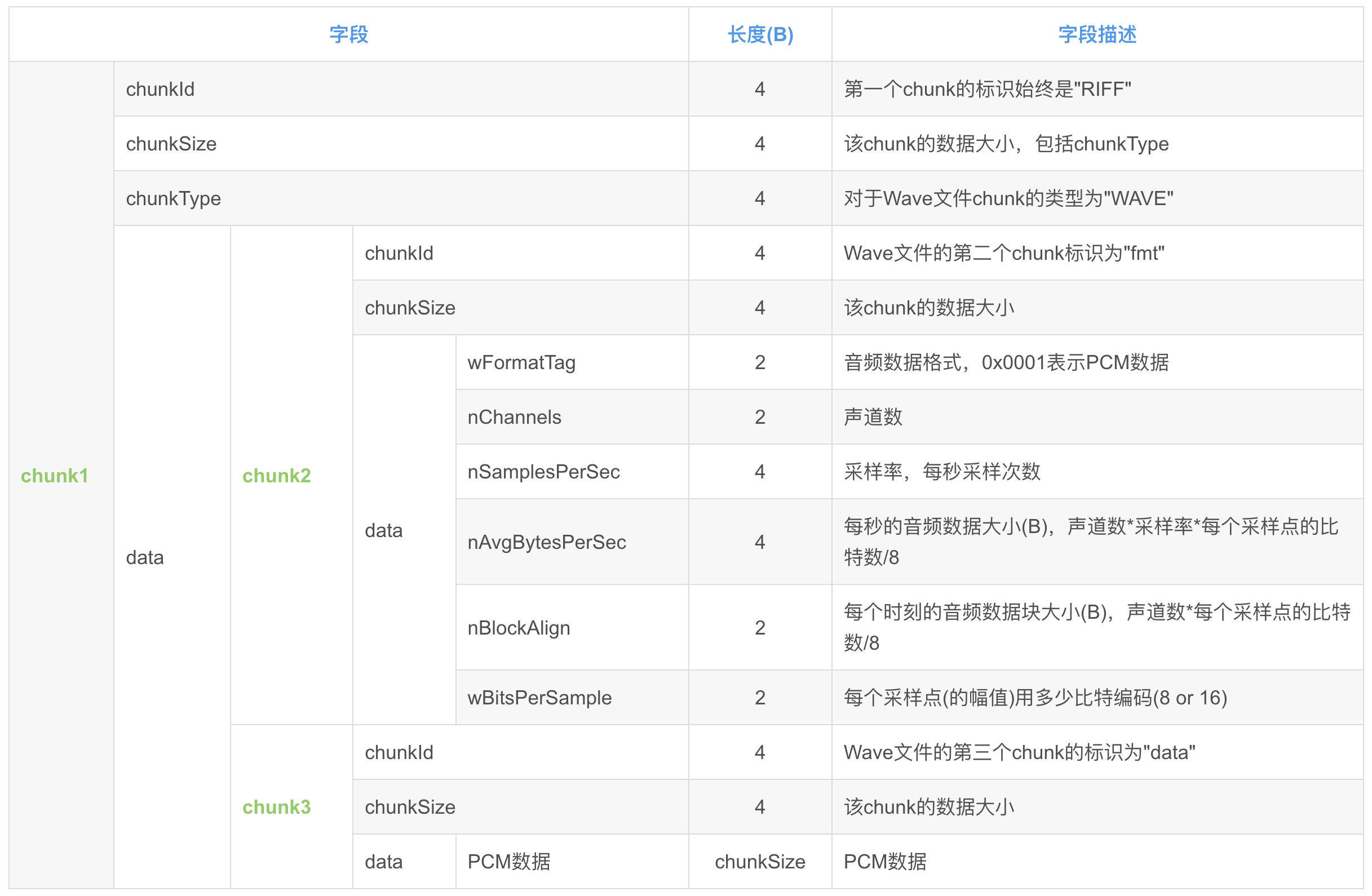 - Wave文件采用RIFF文件格式,当然也就遵循RIFF文件结构。总体来看Wave文件是由多个chunk嵌套组成的。如下表: